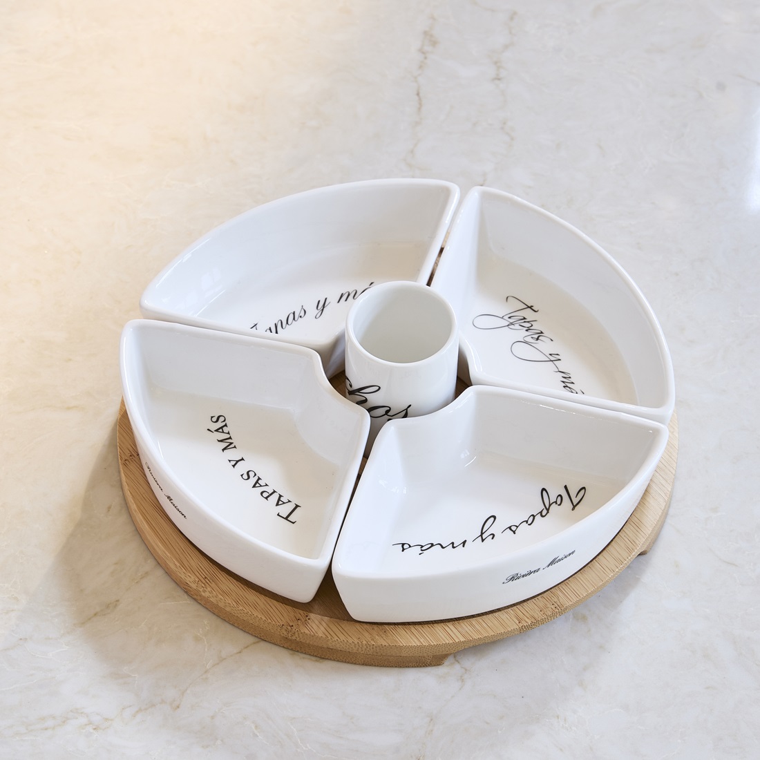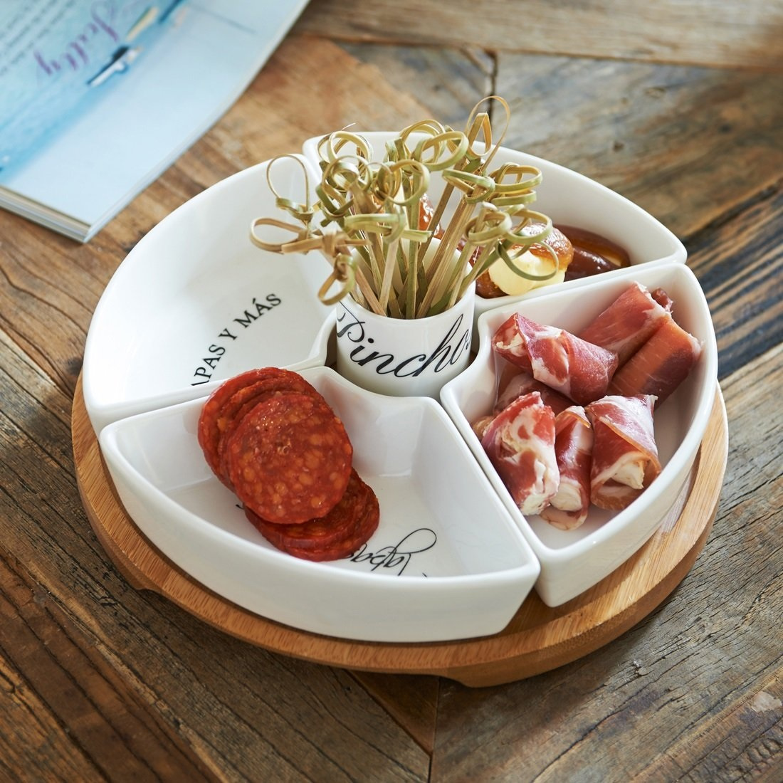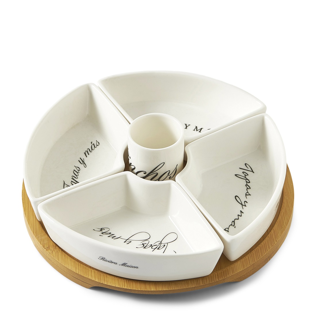 Deze rijk gevulde party plate staat garant voor een gezellige borrel! Een uitgebreid assortiment charcuterie kunt u kwijt in de vier schaaltjes. Daarnaast is het ronde schaaltje perfect voor de prikkertjes en het houten plateau geschikt voor toastjes en stokbrood.