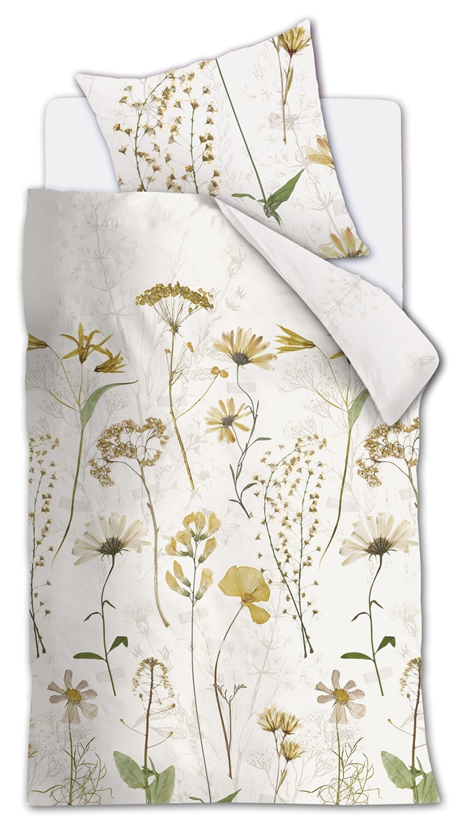 Onder het Ariadne at Home Blow flanel dekbedovertrek val je iedere avond heerlijk in slaap. Het gebroken witte dessin ie voorzien van een dromerige print van droogbloemen. De gouden en groene tinten waarvan gebruikt is gemaakt ogen fris en sfeervol. Op de achtergrond zijn schaduwen getekend van de bloemen, waardoor er een extra dimensie in de print ontstaat. De dubbelzijdige print loopt door op de bijbehorende kussenslopen.