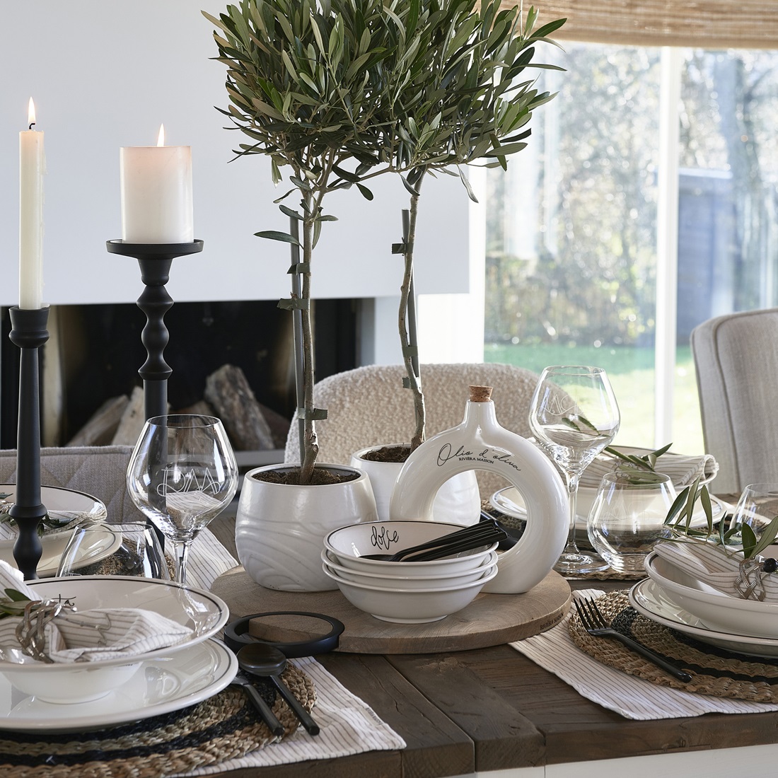 Deze leuke, ronde olijfoliefles is handgemaakt van wit porselein. De witte oliefles heeft een donkere lettering met de tekst: ‘Olio d’oliva, Rivièra Maison’. De fles kan worden geopend en afgesloten met de dop van kurk. Zet de mooie fles op tafel en voeg extra smaak toe aan je gerecht.