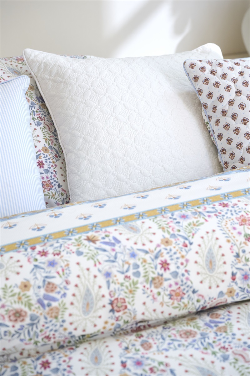 Het Kairi Bloom dessin bestaat uit zwierige paisleys en elegante bloemetjes. Het overtrek heeft rondom decoratieve randen. Sla je het overtrek om, dan heeft de achterzijde een dunne streep. Het overtrek en de kussens zijn luxe afgewerkt met een doorgestikte rand en een ronde bies aan beide zijdes. Door de unieke striksluiting kunnen de kussens, net als het dekbedovertrek, dubbelzijdig gebruikt worden. Dit geeft een speels mix&match-effect op je bed. Het dekbedovertrek is verkrijgbaar in meerdere kleurstellingen.