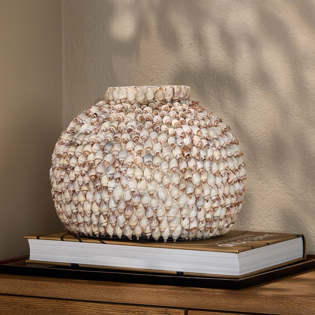 Geef je interieur een verfijnde, natuurlijke uitstraling met de stijlvolle Bay View Shell Vase. Deze decoratieve schelpenvaas is geïnspireerd op de elegante vormen van schelpen en brengt een subtiele kustsfeer in huis. Een verfijnd decorstuk dat direct een gevoel van rust en exclusiviteit in je interieur brengt. Deze ronde vaas is volledig met de hand bekleed met kleine, zorgvuldig geselecteerde schelpen die in een dichte, overlappende structuur zijn aangebracht. De natuurlijke crème‑ en zandtinten zorgen voor een zachte, serene uitstraling, terwijl de subtiele glans van de schelpen het licht op een elegante manier vangt.