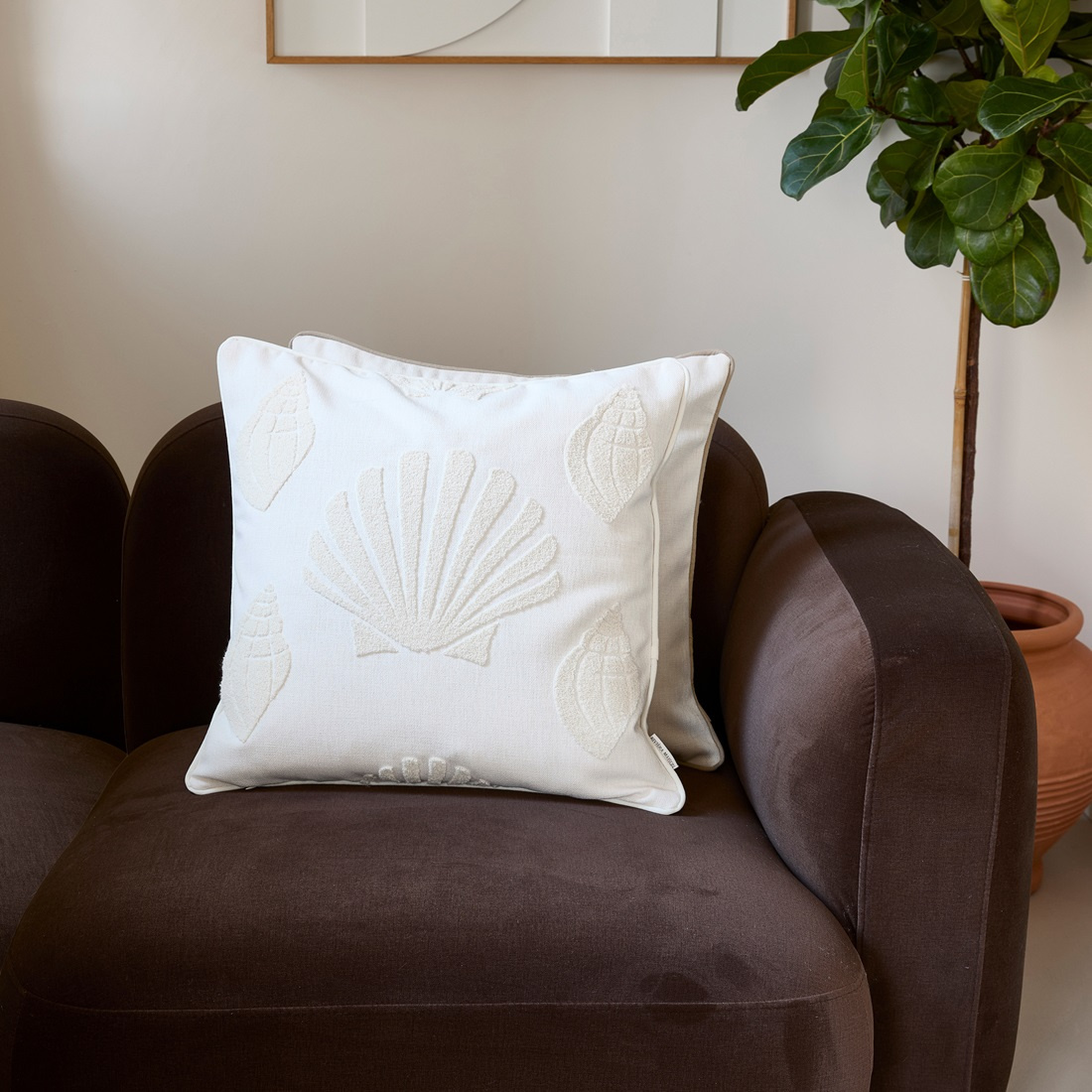 Het kussen heeft een zachte, lichte stof met verfijnd ingeweven schelpmotieven die zorgen voor een subtiel reliëf en een rustige, moderne uitstraling. De ton-sur-ton afwerking maakt het een veelzijdig item dat moeiteloos combineert met verschillende woonstijlen, van minimalistisch tot coastal chic.
