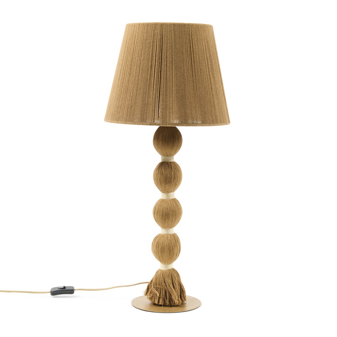 De Nusa Table Lamp in de kleur caramel is een warme en sfeervolle tafellamp met een opvallend, ambachtelijk design. De lampvoet bestaat uit meerdere ronde vormen die volledig zijn omwikkeld met draad, wat zorgt voor een speelse structuur en een natuurlijke uitstraling. In combinatie met de bijpassende lampenkap creëert deze lamp een zacht en diffuus licht dat perfect past in een gezellig en stijlvol interieur.