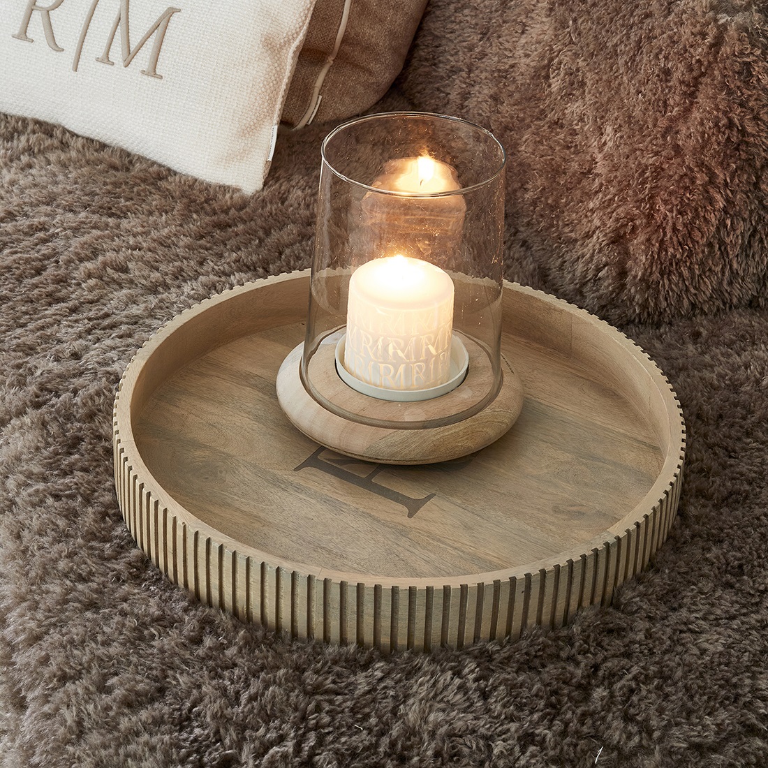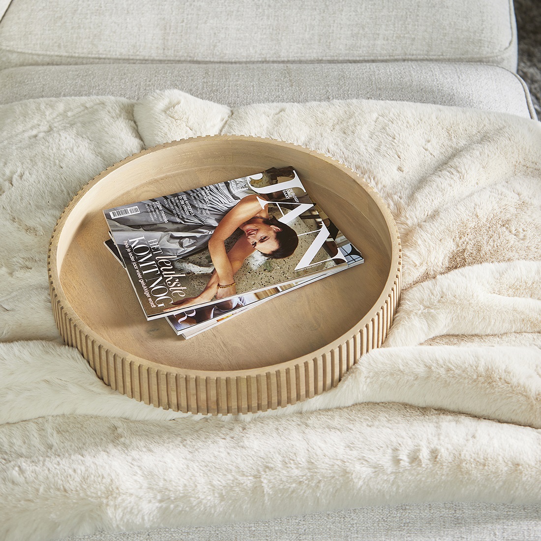 Dit grote dienblad heeft een geribbelde opstaande rand en biedt veelzijdigheid voor zowel het serveren van gerechten als voor decoratieve doeleinden, zoals het plaatsen van een kaars. Het voegt een stijlvolle en elegante touch toe aan elke gelegenheid.
