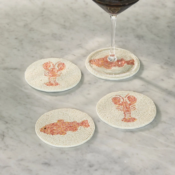 OverzichtBreng een speelse, maritieme sfeer naar je tafel met deze prachtige set van 4 onderzetters. Elk exemplaar is versierd met kleine kraaltjes en heeft een uniek vis- of kreeftontwerp. Een stijlvolle en functionele toevoeging voor gezellige tafelmomenten!