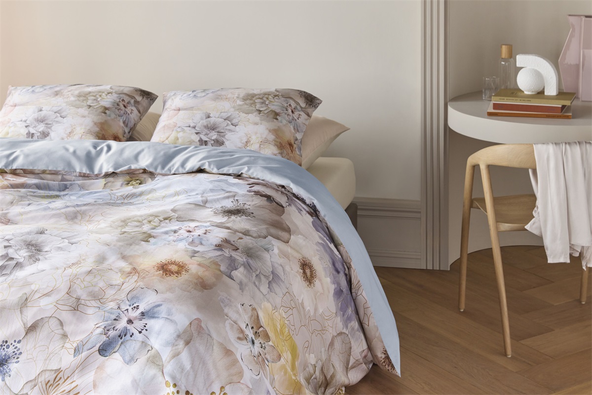Een romantische verschijning, dat is het Kelmscott dekbedovertrek van het bekende merk Kardol. Op het overtrek staat een rijk gevulde bloemenprint in zachte aquarel tinten. Dit kleurpalet oogt sereen en zorgt voor een artistieke touch in het ontwerp. Iedere bloem is anders en door de fijne lijnen ontstaat er een gelaagd effect. De achterkant heeft een effen lichtblauwe kleur, waarmee je eenvoudig een harmonieuze omslag creëert.