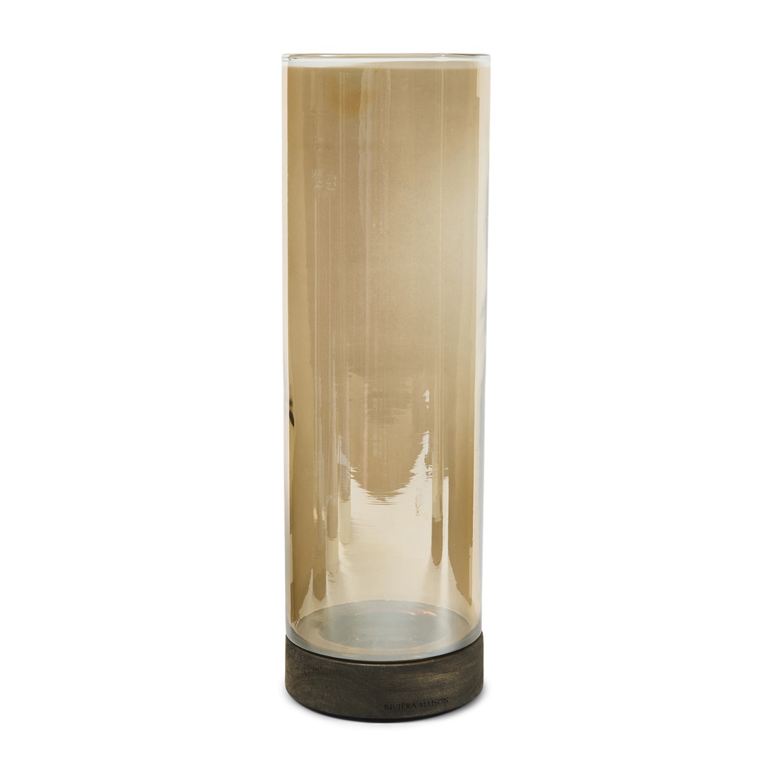 Dit elegante windlicht is een echte sfeermaker die warmte, luxe en rust samenbrengt in één stijlvol ontwerp. De hoge glazen cilinder heeft een subtiele goudtint, waardoor het kaarslicht prachtig wordt verzacht en een warme, uitnodigende gloed door de ruimte verspreidt. De donkere houten basis geeft het windlicht een chique, natuurlijke uitstraling en vormt een stijlvol contrast met het glanzende glas.