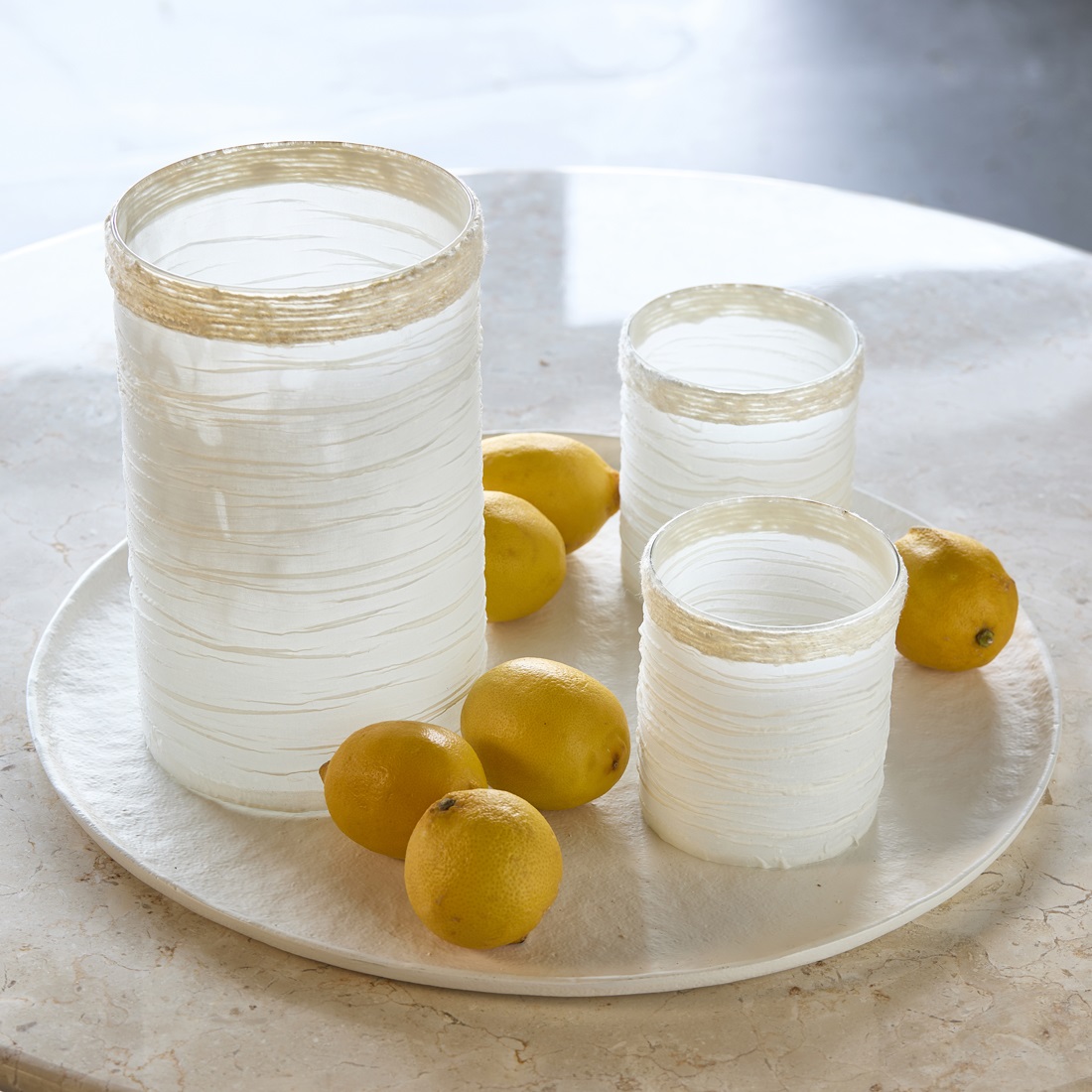 De elegante goudkleurige rand aan de bovenzijde geeft het windlicht een chique, moderne afwerking en vormt een prachtig contrast met het matte wit. Dit maakt het Boheme Votive Large niet alleen een sfeermaker, maar ook een decoratief statement piece dat moeiteloos past binnen moderne, Scandinavische en serene luxe interieurs.
