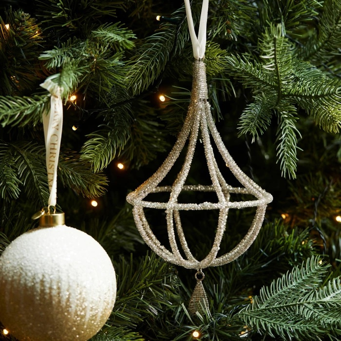Add a touch of glamour to your Christmas tree with our elegant chandelier ornament, richly adorned with sparkling beads. Let your tree shine with the dazzling charm of this ornament.